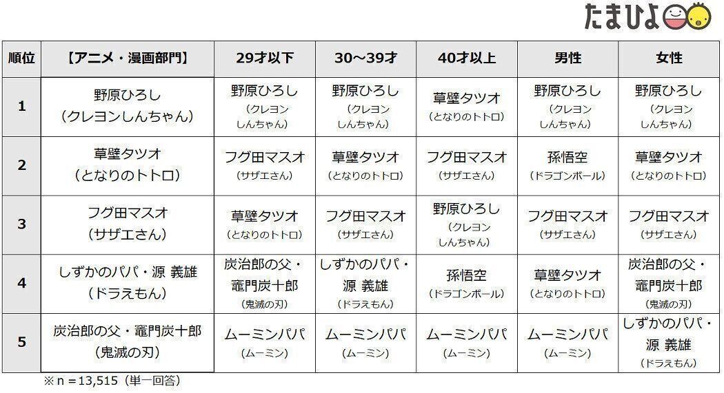 「ひろし以外ありえない。理想のパパ中のパパ!」「みさえを大切にしている」「どこをとっても完璧。足の臭さなんて気になりません。最高のパパ」など、絶賛の声が集まったのが 『クレヨンしんちゃん』の野原ひろしさん。2位の『となりのトトロ』草壁タツオさんには、「もの静かだけれどもしっかりと娘達や奥様を見ている、包容力がある」「初めてトトロを見た時こんなお父さん素敵だなと憧れた」などの声が寄せられました。また、『となりのトトロ』『サザエさん』『ドラえもん』など比較的歴史のある作品が並ぶ中、5位に『鬼滅の刃』から炭治郎の父・竈門炭十郎さんがランクインしたことからも、『鬼滅の刃』の人気の高さがうかがえました。