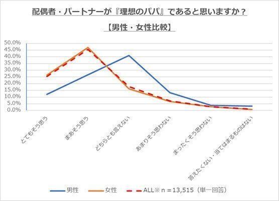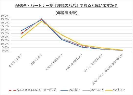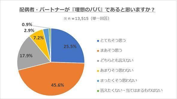 調査では、『理想のパパ』として大切だと思うポイントとして、「家族の時間を大切にする」が最も多くあげられました。また、「配偶者・パートナーが、『理想のパパ』であると思いますか?」という質問に対して、「とてもそう思う・まあそう思う」と答えた方が全体 の約70と過半数を超えたことから、配偶者・パートナーに対する満足度の高い家庭が多いことがうかがえました。