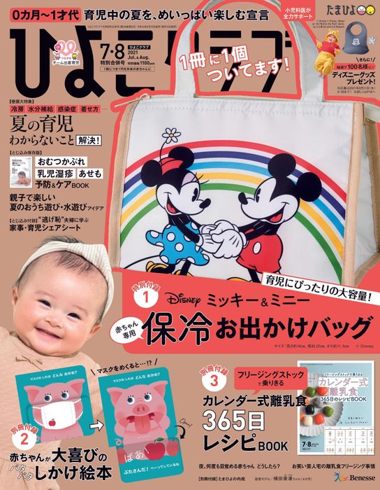 特別付録「ミッキー&ミニー保冷バッグ」が1冊に1個ついてくる!別冊付録『カレンダー式離乳食365日レシピ BOOK』しかけ絵本『 マスクのしたはどんなお顔?』や、「夏の育児わからないこと解決」大特集、おむつかぶれ、湿疹あせも予防&ケアBOOKなどお役立ち特集も満載!